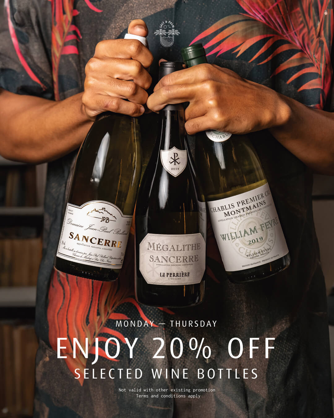 • 50++ per 750ml bottle of wine or BYO 1-for-1. (Maximum of 2 bottles per reservation)